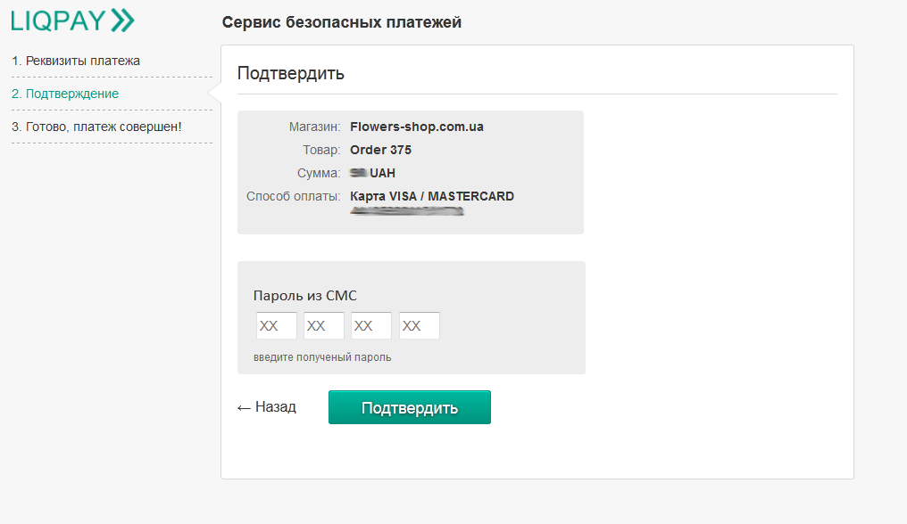 Security of LiqPay services is based on OTP technology and is certified by Visa and MasterCard.